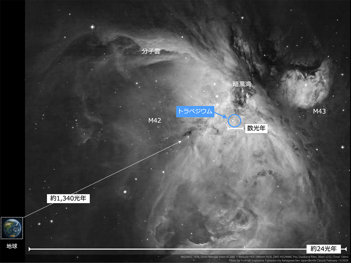 • 星雲全体=約25光年(見かけ65′×60′を距離で換算)