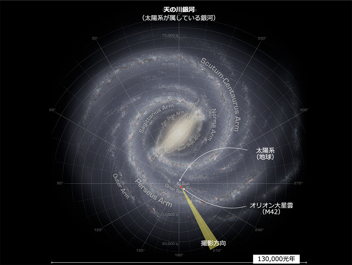オリオン大星雲の位置は、天の川銀河上のうずまきのうち、オリオン・アームと呼ばれる、ひも上の部分にあります。これは、地球が属する太陽系と同じで、実は私たちととても近い天体なのです。