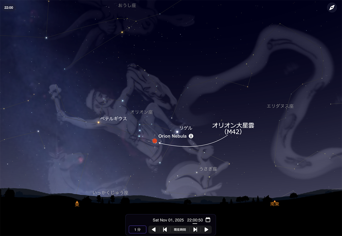 図表:天体アプリSkySafari(2025年11月1日22:00の空を表示)に杉山さんが加筆