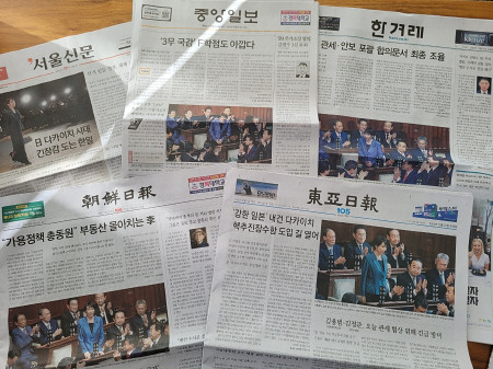 韓国の有力紙は22日、高市早苗氏の首相就任を一斉に1面で報じた。21日夜の就任会見で、日韓関係を重視する姿勢を示したことを好意的に伝えている=ソウル 【時事通信社】