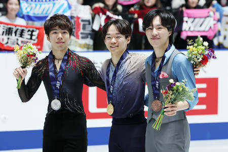 フィギュアスケートの全日本選手権第2日。男子の表彰式で笑顔の(左から)2位の佐藤駿、優勝の鍵山優真、3位の三浦佳生=20日、東京・国立代々木競技場 【時事通信社】