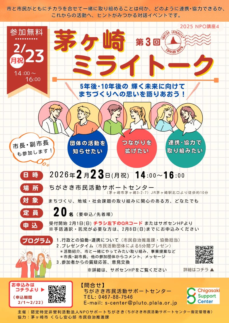 第3回「茅ヶ崎ミライトーク」が2月23日、ちがさき市民活動サポートセンター(茅ヶ崎市茅ヶ崎3)で開催される。