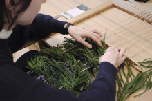 石川県白山市の山間部で林業を営む白峰産業が供給する「白峰スギ」の枝葉を使い、染織家の安部里香さん指導の下、香りを楽しめる壁掛け型のタペストリーを作る。