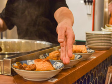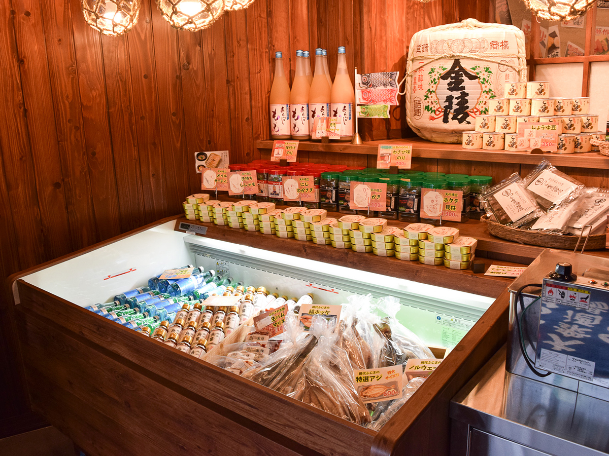 日本酒や干物などが並ぶお土産コーナー