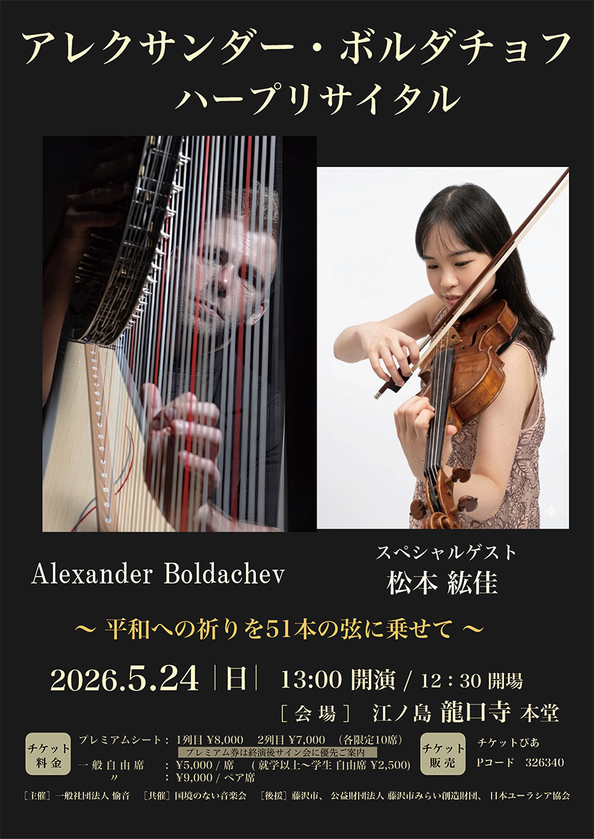 ハープ奏者のアレクサンダー・ボルダチョフさん(ロシア出身、スイス国籍)によるハープリサイタル「平和への祈りを51本の弦に乗せて」が5月24日、藤沢の龍口寺(藤沢市片瀬3)本堂で行われる。