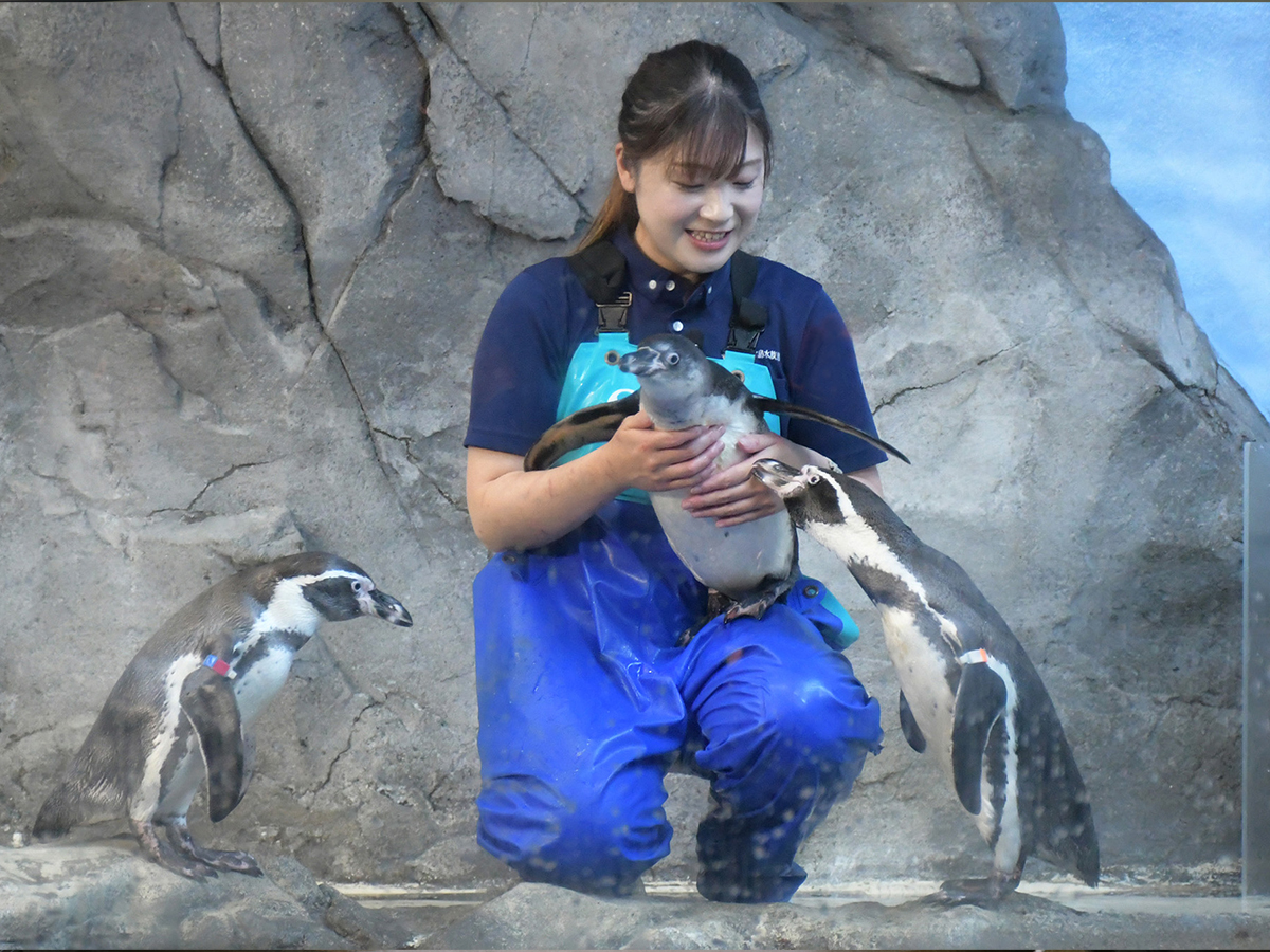 トリーターに抱っこされる「ナギ」と育ての親ペンギン