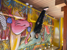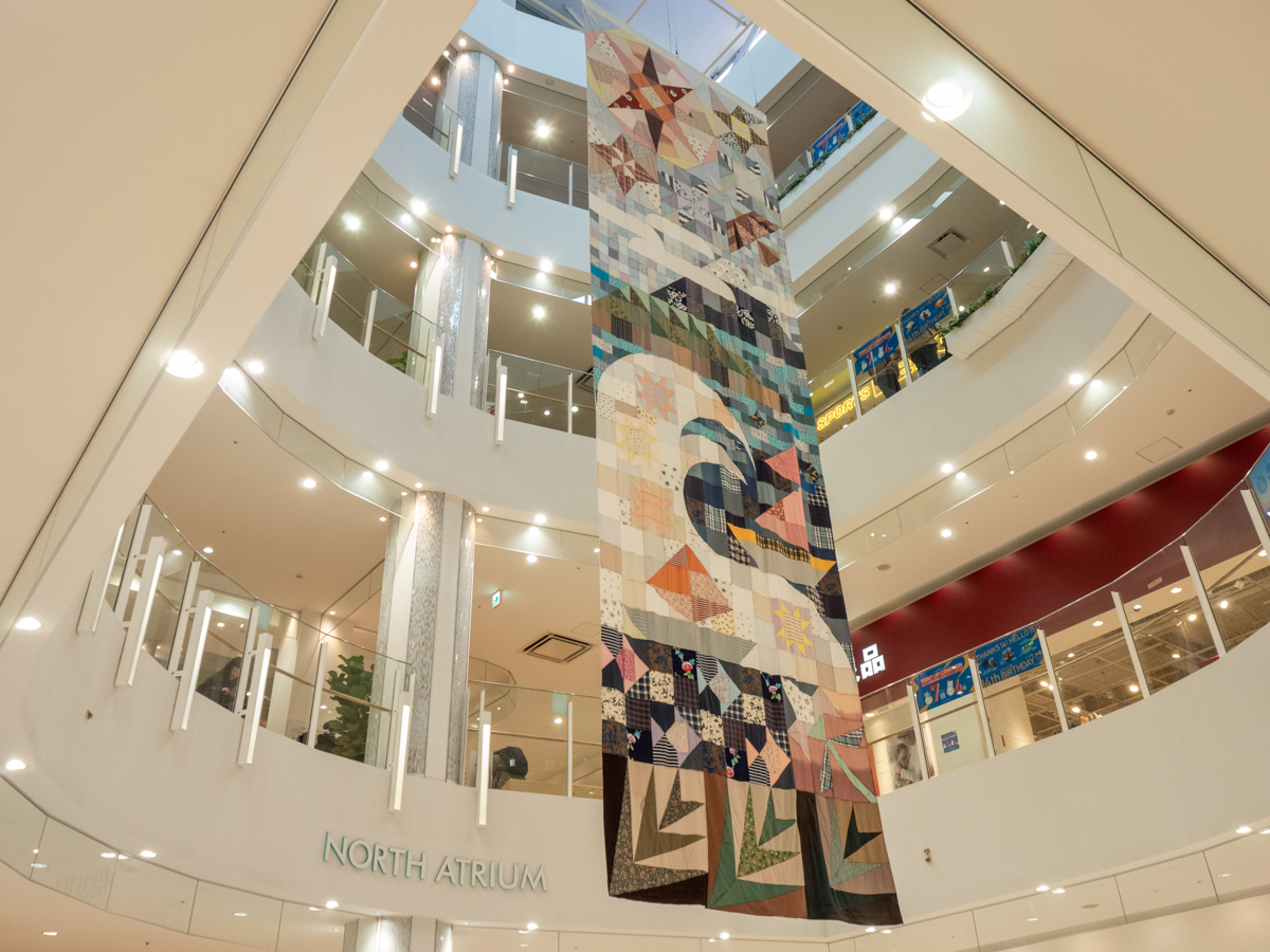 同イベントの一環でテラスモール湘南1階北アトリウム吹き抜けに展示中のパッチワーク作品「Patch the Shonan Places」。利用客から募集した古着を利用して制作された。