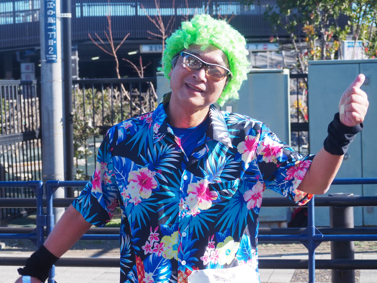 鎌倉市から来た69歳の参加者「マラソンは人生そのもの。沿道の応援が力になるので目立ちたい。仮装は毎回変えている」