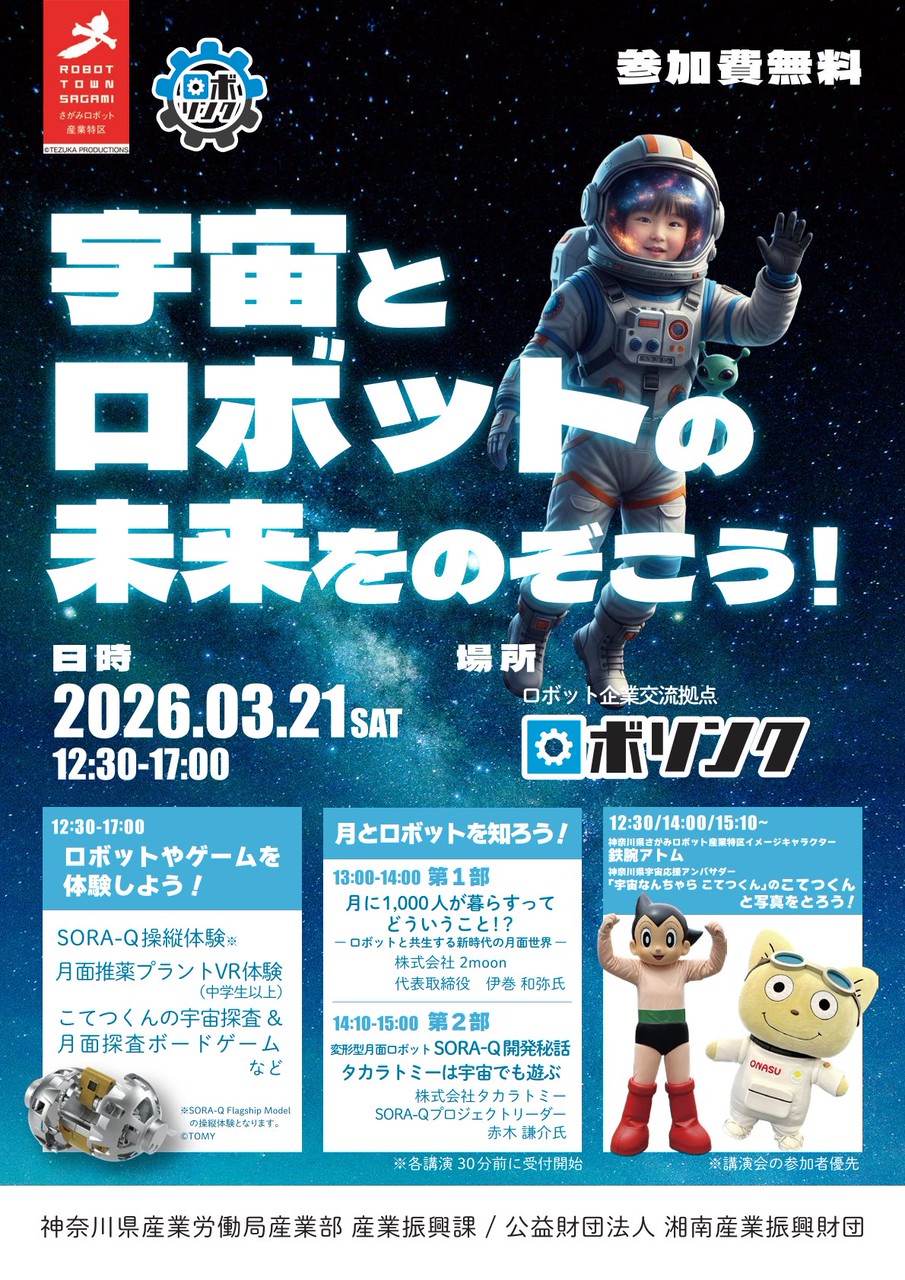 宇宙とロボットをテーマにした体験イベント「宇宙とロボットの未来をのぞこう!」が3月21日、ロボット企業交流拠点「ロボリンク」(藤沢市藤沢、TEL 0466-90-3490)で開催される。