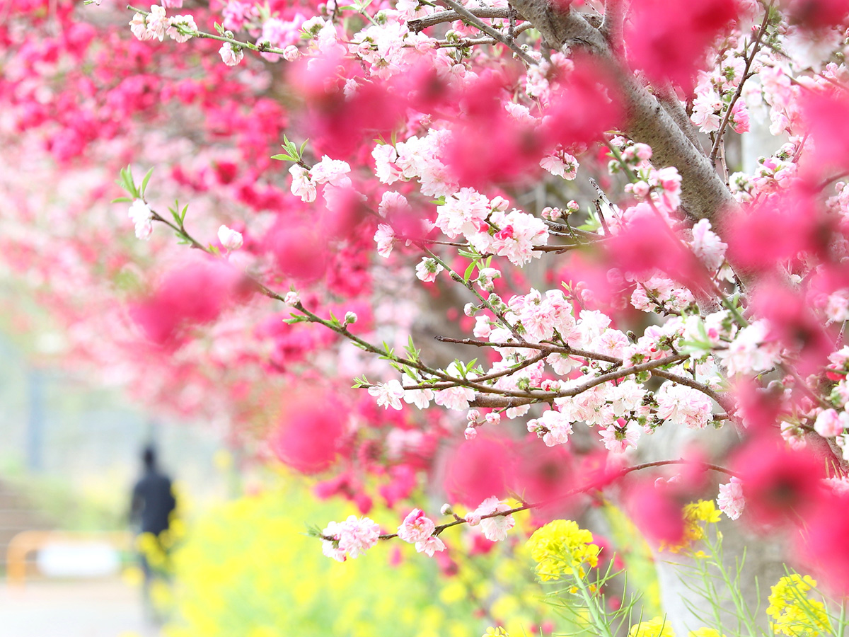 花桃三色と黄色の菜の花(2022年4月撮影)