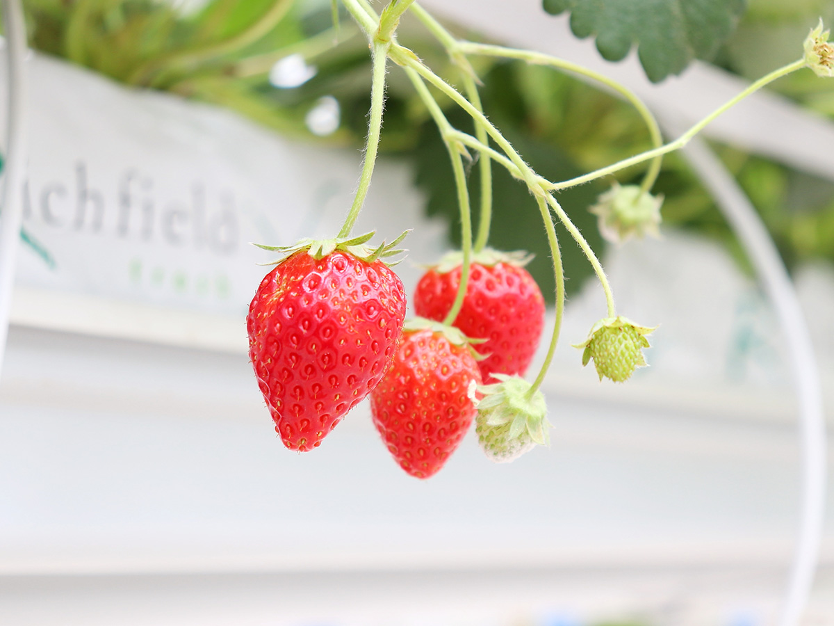 天井からつり下げたイチゴが特徴の次世代型イチゴハウス「宙苺(SORA ICHIGO)湘南藤沢」(藤沢市打戻字大下)がオープンして、3月末で2カ月がたつ。