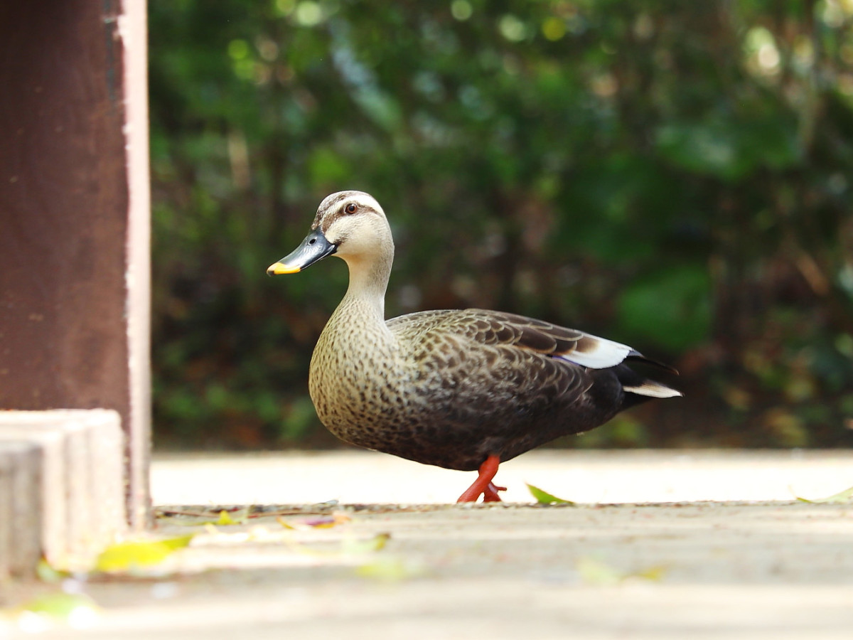 新緑の渓流広場周辺を歩くカルガモ(2026年4月11日撮影)